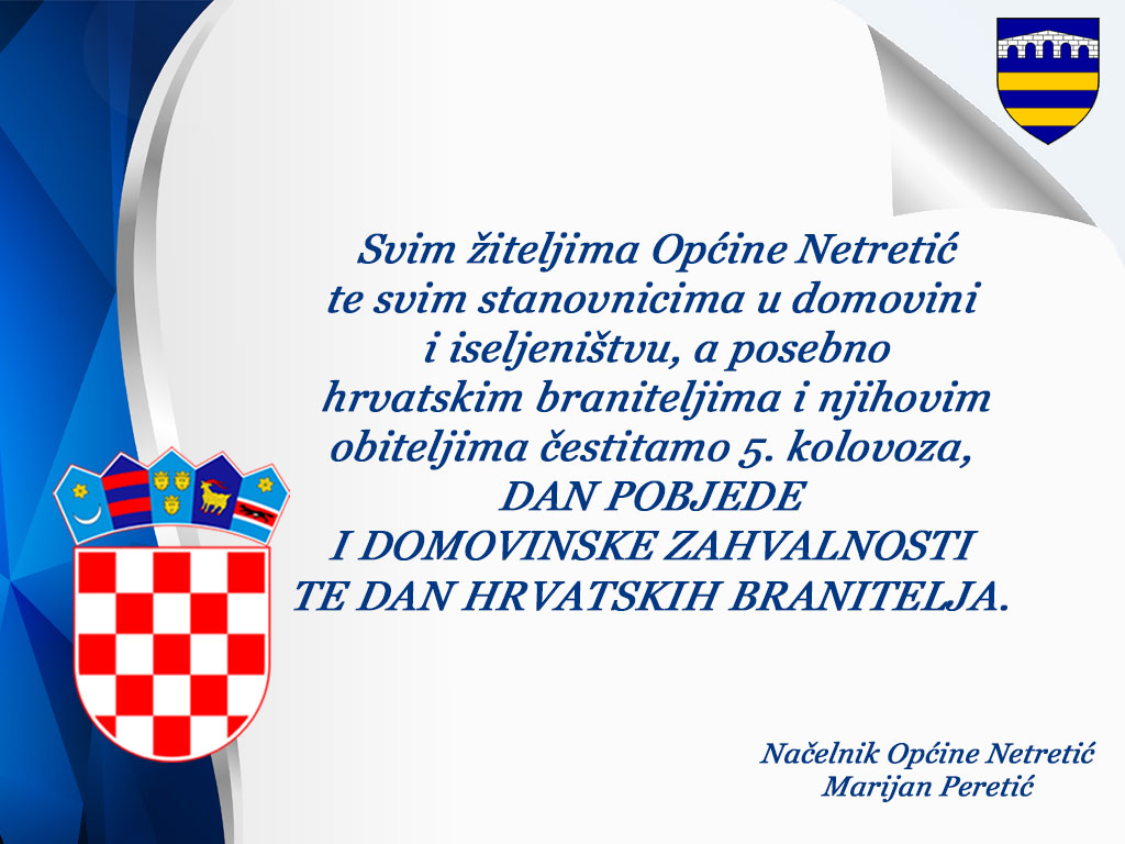 Svim žiteljima Općine Netretić te svim državljanima i državljankama Republike Hrvatske u domovini i iseljeništvu čestitamo 5. kolovoza, Dan pobjede i domovinske zahvalnosti te Dan hrvatskih branitelja.